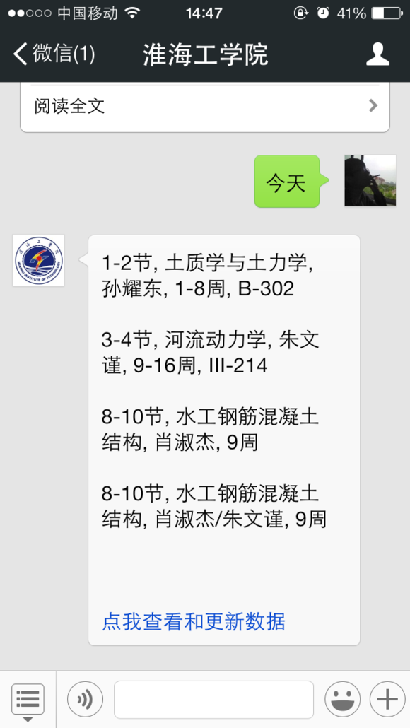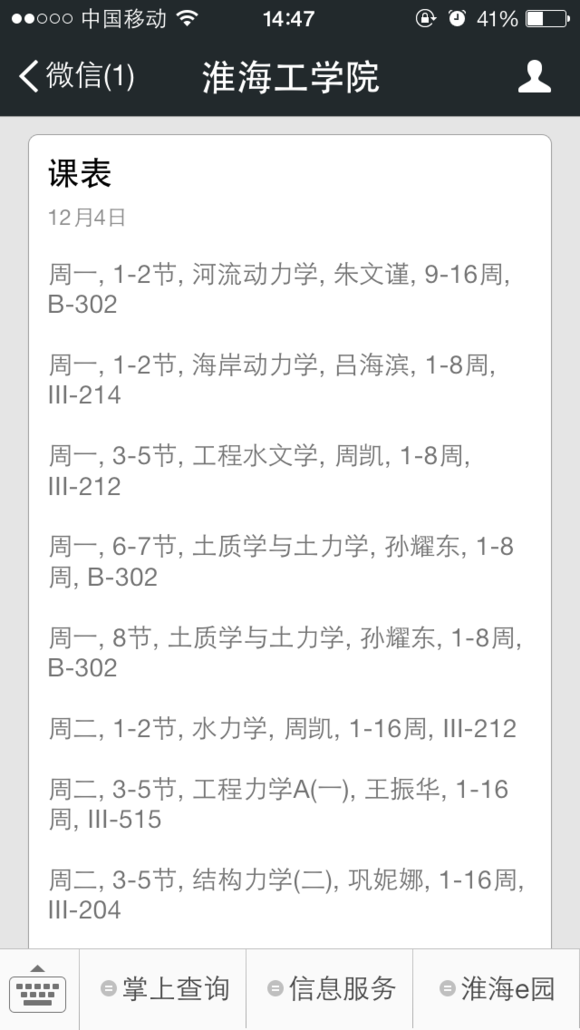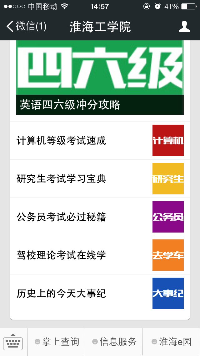 我校官方微信公众平台(试用版)目前包含有“掌上查询、信息服务和淮海e园”三大栏目,通过该平台可以实现后台的用户分组和地域控制,用文字、图片、语音等多种形式实现精准的消息推送。我校官方微信公众平台(试用版)三大栏目功能如下: