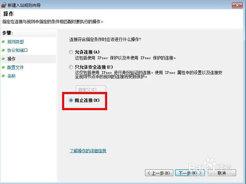 7、点击下一步,选择“特定本地端口”,输入“135,137,138,139,445”,端口号中间用逗号隔开即可,选择“阻止连接”,然后点击下一步;