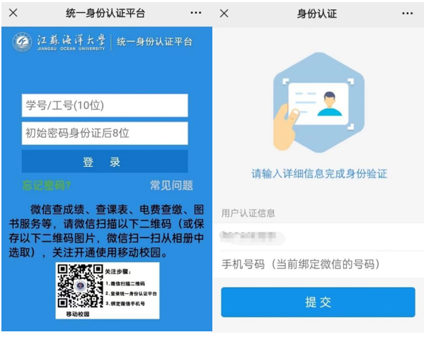扫码成功后会出现江苏海洋大学的统一身份认证平台,账号为学号/工号(10位),初始密码默认为身份证后8位。在输入正确的账号和密码后,会进入到身份认证界面,这里需要输入你当前微信绑定的手机号,将你的学号/工号与你的手机号绑定起来。