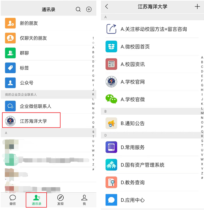 方式一:通过微信APP,进入我的微信“通讯录”——“我的企业及联系人”——“江苏海洋大学”,便可以到应用中查询处理各项事务。
