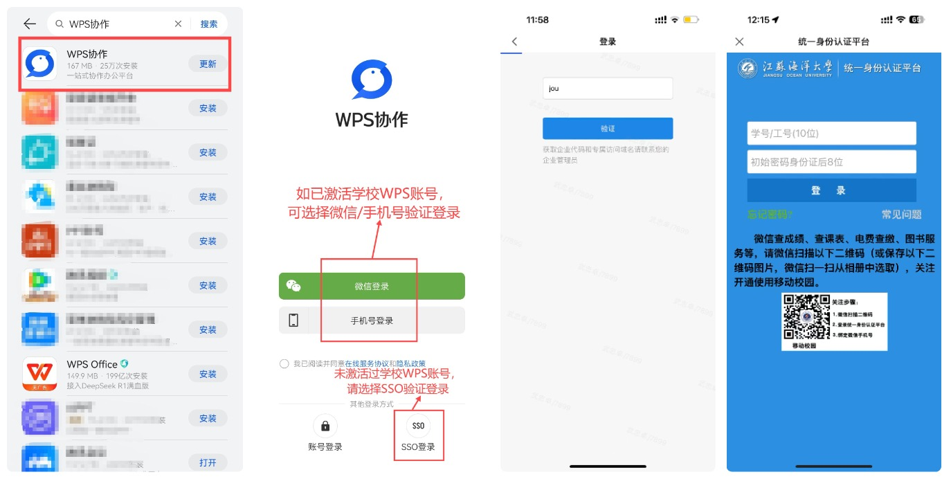 微信/QQ搜索「金山文档」小程序,通过微信/手机号码登录「江苏海洋大学」WPS学校账号。