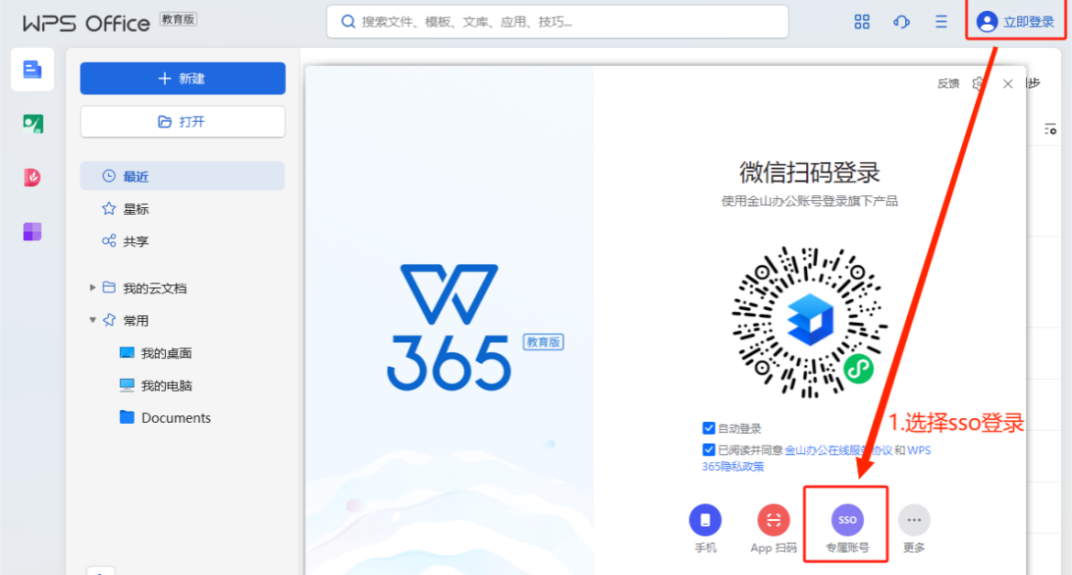 (1)打开WPS软件首页,点击右上角「立即登录」,选择「SSO专属账号」。