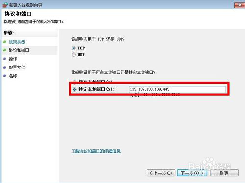 7、点击下一步,选择“特定本地端口”,输入“135,137,138,139,445”,端口号中间用逗号隔开即可,选择“阻止连接”,然后点击下一步;