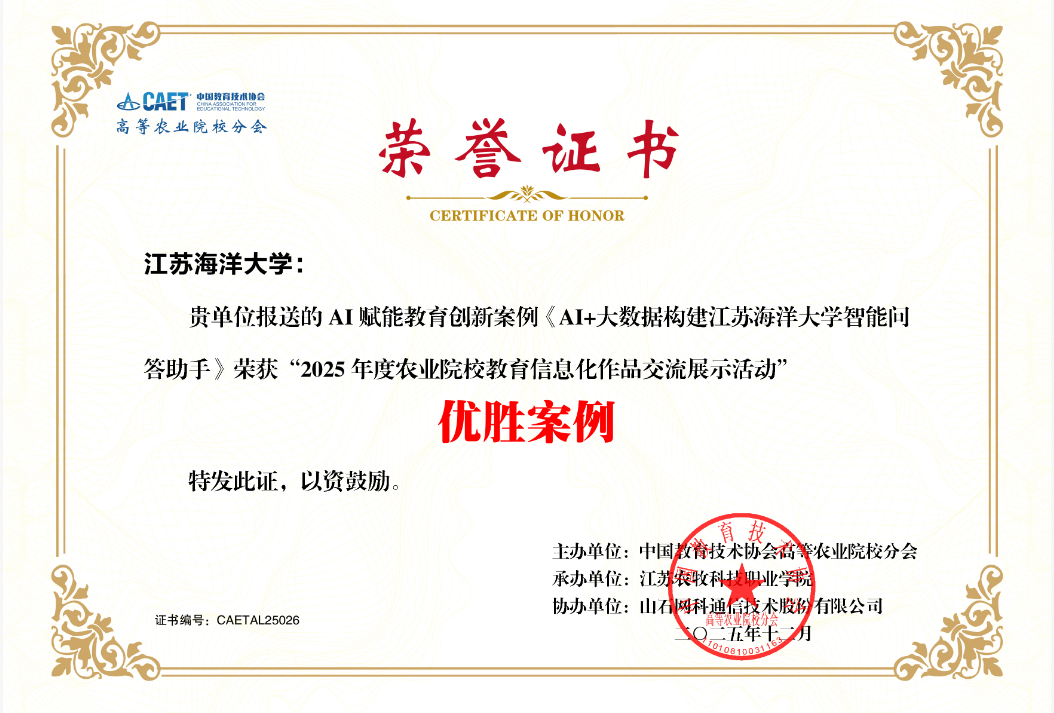 部门先后获评“中国教育技术协会高等农业院校分会(CAET)先进集体”“江苏省信息安全标准化技术委员会优秀团队”;“AI+大数据智能问答助手”项目荣获CAET“AI赋能教育创新优胜案例”;一卡通系统建设项目入选国家先进计算产业创新中心“光合组织优秀案例”。此外,部门1名同志荣获CAET“先进工作者”,1人获评“江苏省信息安全标准化技术委员会优秀个人”,1人获“江苏省高校网络技术专业委员会优秀个人”。