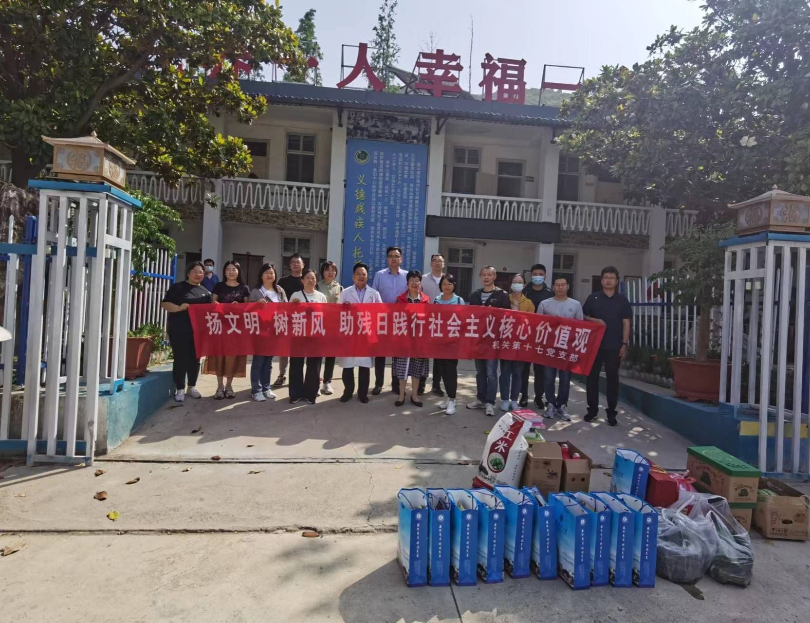 为深入学习贯彻党的二十大精神,践行文明、和谐、友善的社会主义核心价值观,5月21日上午,值此第三十三个全国助残日来临之际,机关第十七党支部组织全体党员、入党积极分子、部分职工来到江苏省连云港市义德康乐医养中心,开展“扬文明、树新风,助残日践行社会主义核心价值观”主题党日活动。